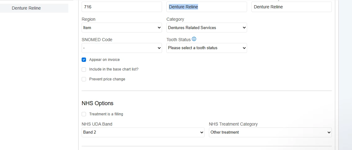 Hi, I had several practitioners ask if we can change certain NHS treatment categories. One example is for the code 716 Denture Reline. it is classed as Other treatment. Would that have an impact on the claims being sent if we change it? I was under the impression that NHS codes are automatically updated by Dentally as per NHS guidance. My change would be done for several sites so I wanted to ask for a second opinion.