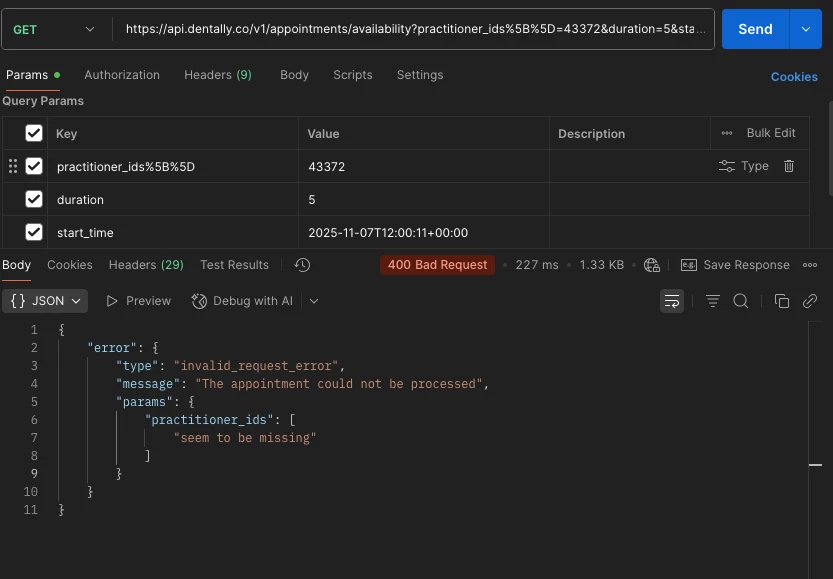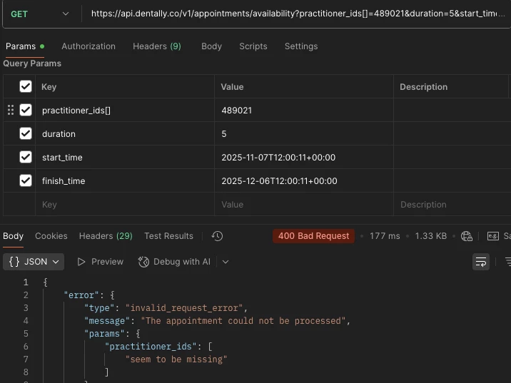 When sending an API request for practitioner appointment availability, I get the error below.