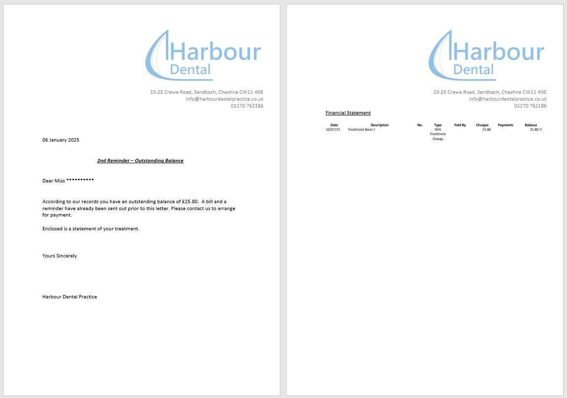 Does anyone have any advice on how to easily keep on top of patient debts? In my practice it is me who is in charge of collecting any overdue charges from patients. I like to do this once a month but I am yet to find a simple way to keep track of this. Is there a way to bulk send letters to patients? And is there a way to show to patient what it is they owe for without doing it manually. I work in a large practice with around 22,500 patients so an automated bulk system is what I am after. I have attached photos of what I was used to with our previous computer software.
