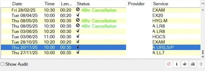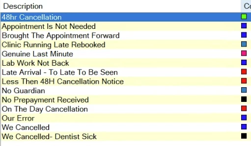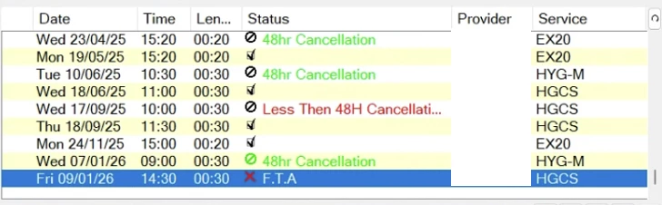 Colour coding cancellation reasons (for example, on-the-day, late notice, sufficient notice) would make patterns immediately visible and allow teams to apply appointment policies consistently and fairly.