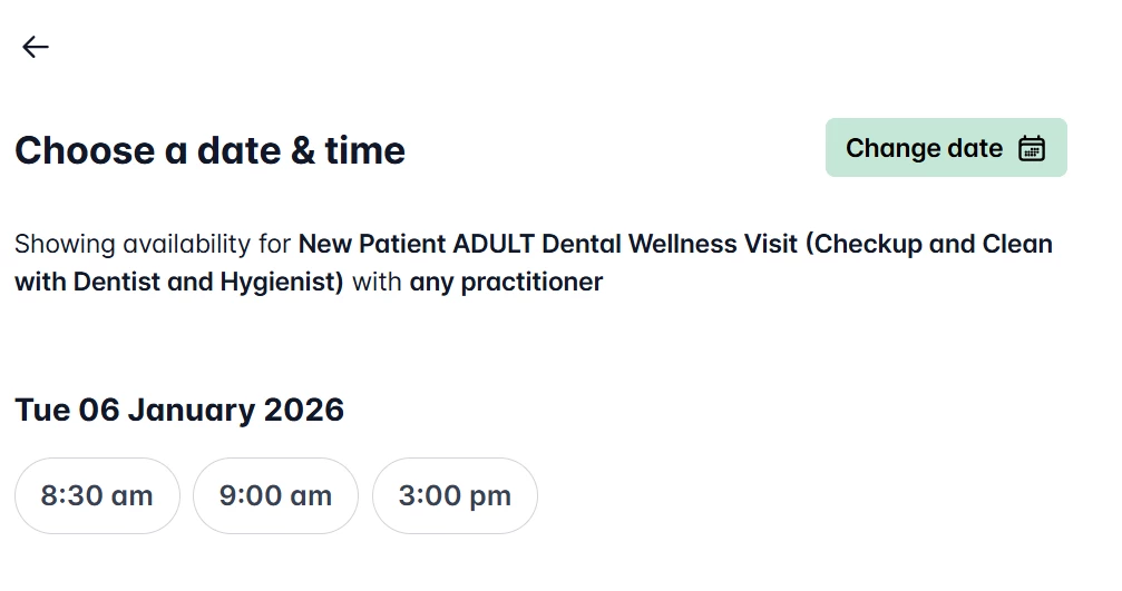 We've had a significant growth in organic search traffic and Google ads traffic. Whilst looking into why that isn't converting to more New Patients, we found the booking portal starts off by asking if you are a new/existing customer --> What type of appointment are you after—> Choose your practitioner and see availability. Screen shot is attached of the next step "Choose a date and time".