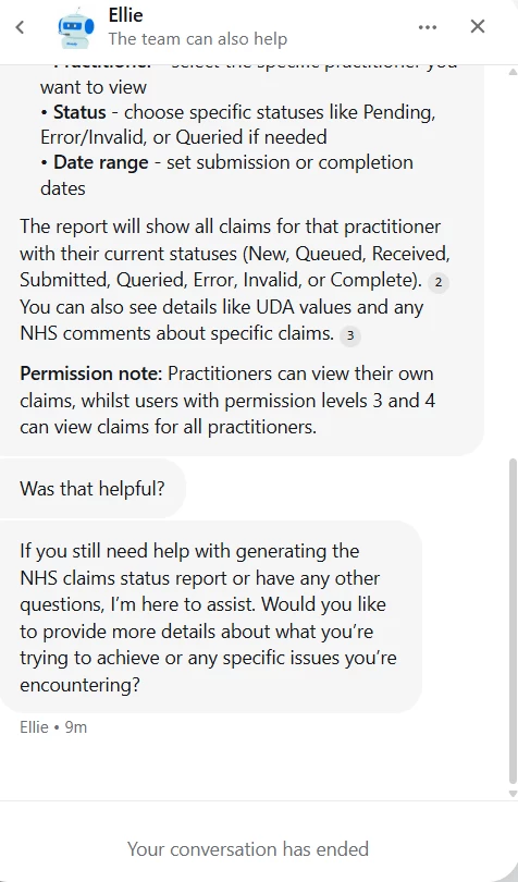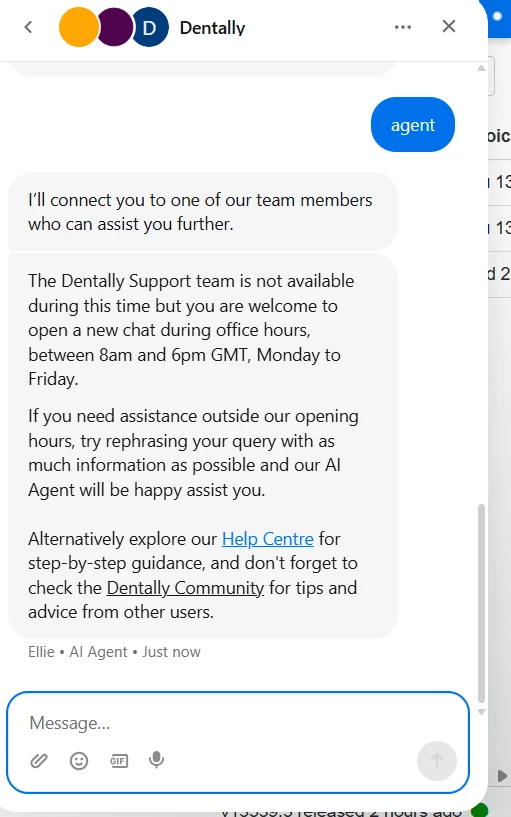 The situation is now made worse by the fact that Dentally now appear to have switched off the ability for clients to be able to send offline support requests via Ellie / chat bot outside of regular hours (when the question is more technical and cannot be answered by Ellie ai). This is really a step backwards and a total disregard for clients - why would Dentally do that? Aside from increasing the monthly fees from this month, how is this in any way client centric, is Dentally tryin to avoid a pile of new support requests from appearing at 9am on Monday morning from the weekend?